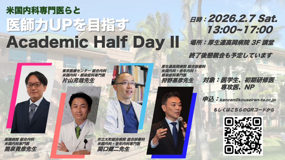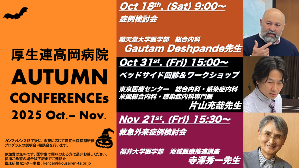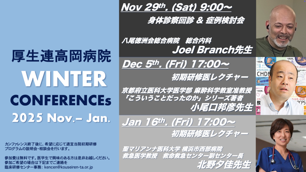 また当院では、院外から招聘した有名講師による研修医レクチャー&症例検討会が頻回に行われております。富山にいながら全国でもトップレベルの医学教育を受けることができるのが当プログラムの特徴です。外国人医師による症例検討会も頻回に行われ、英語によるコミュニケーションの みならず症例の議論もできるようにスケジュールが組まれています。