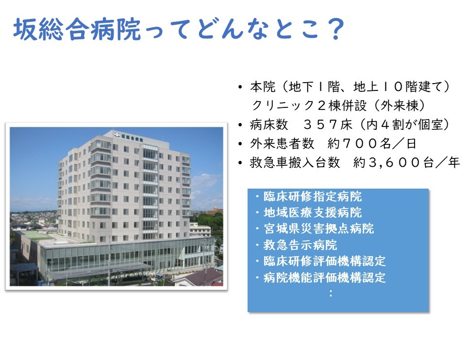 (1)坂総合病院群基礎研修プログラム(募集11名)特徴:救急からリハビリ・在宅往診まで継続的な医療を提供する当院の特徴を生かし、地域密着型の研修を実践している。歴史あるローテート研修では、内科を最低9カ月、全員が呼吸器、循環器、消化器を3カ月ずつ研修。さらに地域医療の枠として、通年の訪問診療に加え、仙台市北部にある小規模病院という地域医療の最前線で、3カ月じっくりと基礎力を磨く。指導医の多くは当院での研修後に外部専門機関で専門研修を受け、共通する指導基盤と高い専門性も両立。研修専属の事務を配置し、充実したサポート体制を確立している。(2)坂総合病院群総合診療・地域医療重点プログラム(募集2名)特徴:内科研修は総合診療科での研修を中心とし、必要に応じて臓器別各科や小規模病院の一般内科での研修も可能。救急部門は1年次に救急部でのブロック研修12週、2年次にはICU管理も含めた8週間のアドバンスト研修を行う。時間外および救急外来、当直、救急車当番は通年実施。地域医療は1年次後半~2年次前半に協力型病院・施設における2週間の見学研修を複数回行い、2年次に小規模病院での16週のブロック研修を実施。並行して在宅医療、健診、地域研修(健康友の会班会)を半日1単位で年15単位程度実施。