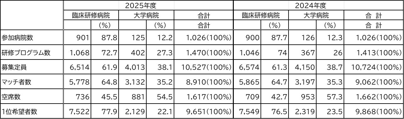 大学病院と臨床研修病院の充足率(マッチ者数/募集定員)を比較してみると、2025年度は大学病院は78.0%、臨床研修病院は88.7%、マッチ者数の割合も2024年度比較で大学病院は35.3%→35.2%、臨床研修病院は64.7%→64.8%となっており、前年に引き続き臨床研修病院の人気が高いことが見てとれます。