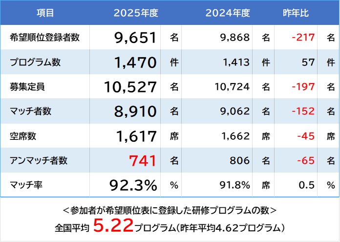 2025年10月23日に2025年度の医師臨床研修マッチング結果が公表されました。今年度の募集定員は10,527人で、昨年度に引き続き若干減少しました。希望順位を登録した参加者の数は9,651名、マッチ者数は8,910名、マッチ率は92.3%と希望順位登録者数は微減となったもののマッチ率は増加する結果となっています。参加者の平均プログラム登録数が3年連続で上昇していることも影響していると考えられます。