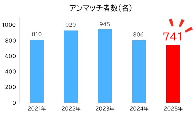 上記グラフは過去5年間のアンマッチ者の推移です。昨年はアンマッチ者数が大きく減少しましたが、そこからさらに減少し、741名という結果でした。