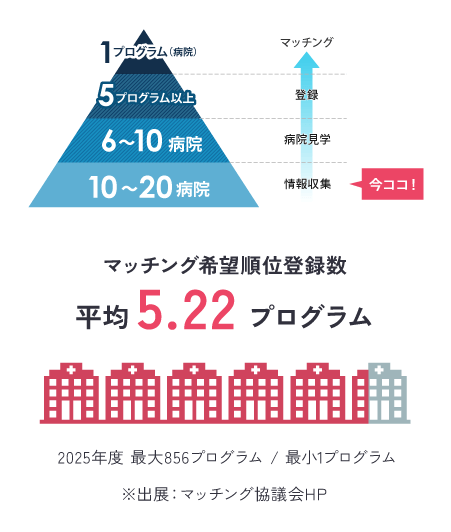 マッチングに登録する平均病院数は5.22病院。最低5病院登録すると考えて、逆算してみましょう。
